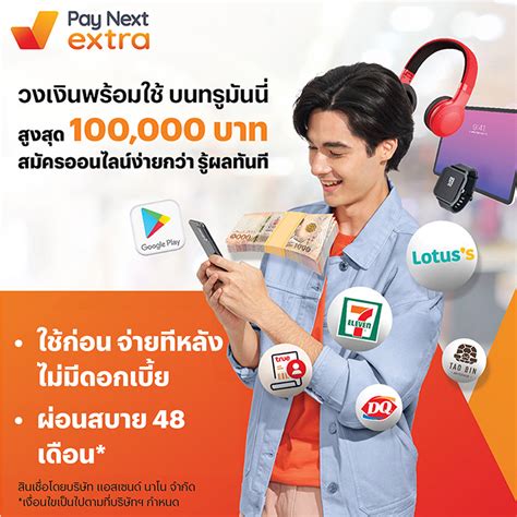 pay next extra ใช้ก่อน จ่ายทีหลัง ไม่มีดอกเบี้ย. เมื่อจ่ายเต็มจำนวนตรงตามวันที่กำหนด สแกนจ่ายได้กว่า 7 ล้านจุดทั่วไทย. ผ่อนนานสูงสุด 48 เดือน. ได้ที่ร้านค้าชั้นนำ เช่น True Shop, Lotus's, IT City, ...