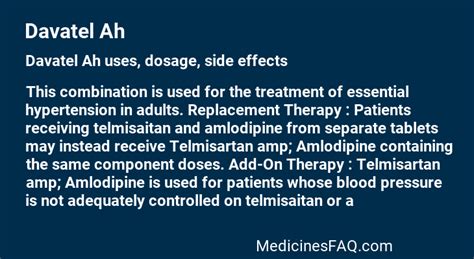 davatel h Take this medicine in the dose and duration as advised by your doctor. Swallow it as a whole. Do not chew, crush or break it. Davatel H 40mg/12.5mg Tablet ...