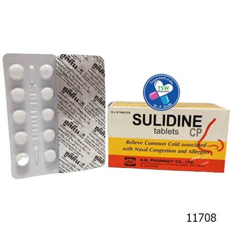Sulidine เป็นชื่อทางการค้าของยาสูตรผสมซึ่งเดิมมีตัวยาสำคัญ คือ pseudoephedrine hydrochloride 60 มิลลิกรัม และ triprolidine hydrochloride 2.5 มิลลิกรัม ...